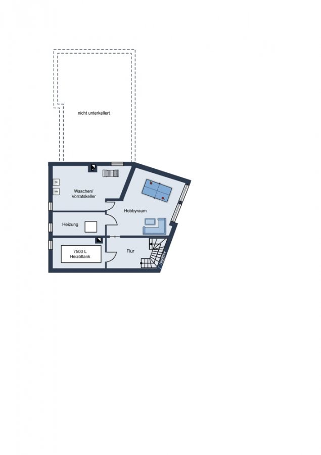 ...IM KELLERGESCHOSS: EIN FLUR, EIN HOBBYRAUM MIT DEN HAUSANSCHLÜSSEN, EINE WASCHKÜCHE MIT VORRATSFLÄCHE, EIN HEIZUNGSRAUM UND EIN HEIZÖLTANKRAUM MIT EINEM 7.500 LITER FASSENDEN STAHLTANK.