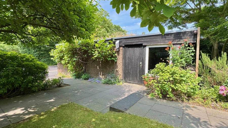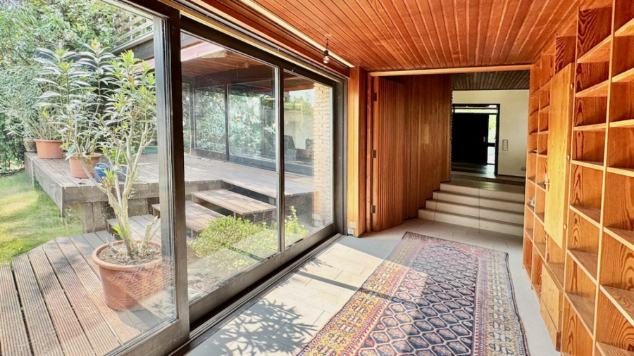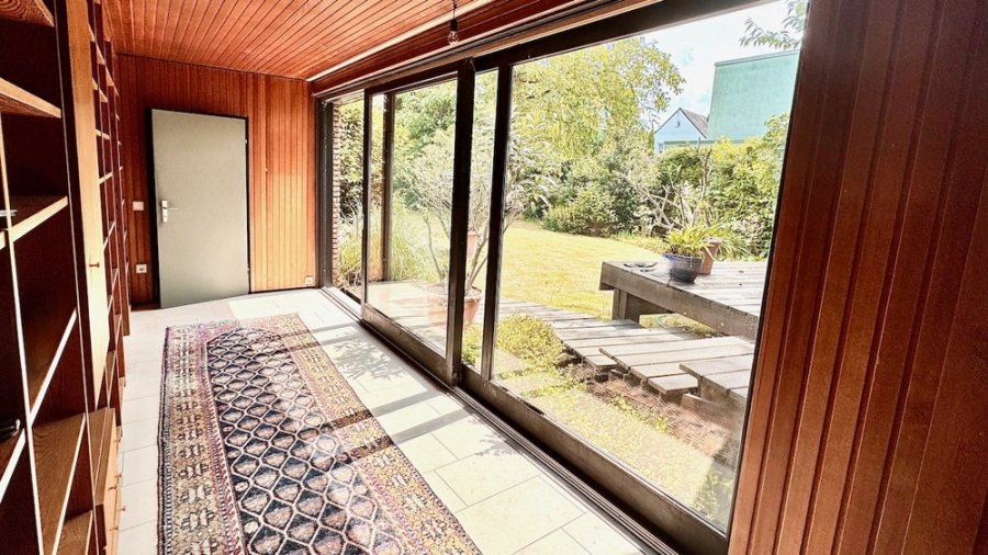 VOM WOHNRAUM IM ERDGESCHOSS GELANGT MAN AUF DIE SÜDLICH AUSGERICHTETE ECHTHOLZTERRASSE UND WENIGE STUFEN HINAB IN DEN HAUSGARTEN. DIESER VERFÜGT ÜBER EINE GROßZÜGIGE RASENFLÄCHE UND IST TEILS MIT IMMERGRÜNEN, TEILS MIT BLÜHENDEM STRAUCH- UND BAUMWERK EINGEFRIEDET.