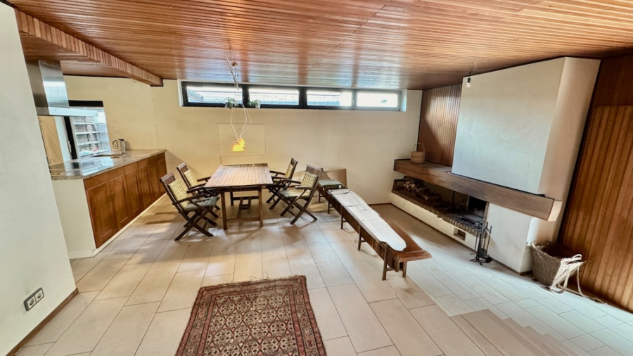 ...IM ERDGESCHOSS: EINE GROSSZÜGIGE EINGANGSDIELE MIT DEM RECHTS NEBEN DEM HAUSEINGANG GELEGENEN TREPPENAUFGANG INS OBERGESCHOSS. WEITERHIN ERREICHT MAN IM DIELENBEREICH DIE GÄSTE-TOILETTE, DEN TREPPENABGANG IN DEN KELLER, DAS GROSSZÜGIGE, GARTENSEITIGE WOHNZIMMER MIT WOHNKÜCHE UND OFFENEM KAMIN.