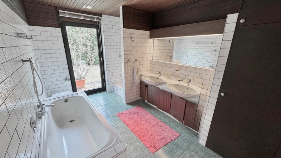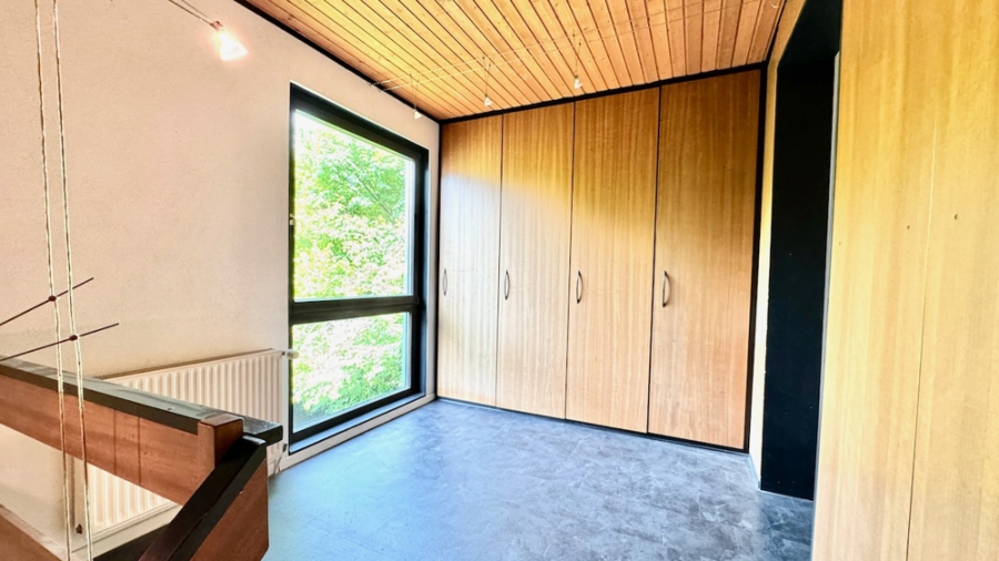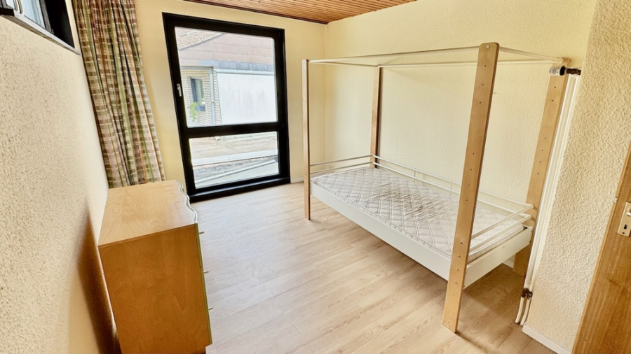 ANSCHLIESSEND HIERAN DER EINGESCHOSSIGE SCHLAFTRAKT DES URSPRÜNGLICHEN BUNGALOWS MIT FLUR, KINDERZIMMER, TAGESLICHTBAD MIT WASCHTISCHEN, TOILETTE, WANNE UND DUSCHE SOWIE DAS ELTERNSCHLAFZIMMER.