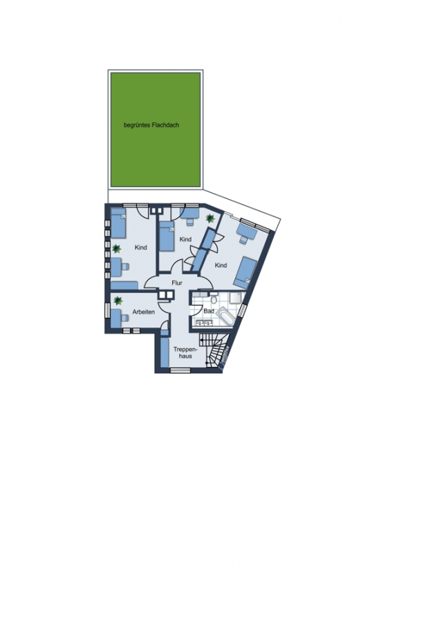 ...IM OBERGESCHOSS: EIN TREPPENPODEST MIT ANSCHLIEßENDER DIELE, EIN ALS ARBEITSZIMMER BEZEICHNETER RAUM, DREI GARTENSEITIGE KINDERZIMMER MIT JE ZUGANG AUF DEN RÜCKWÄRTIGEN BALKON, EIN TAGESLICHTBAD MIT TOILETTE, WASCHTISCH, WANNE UND DUSCHE.