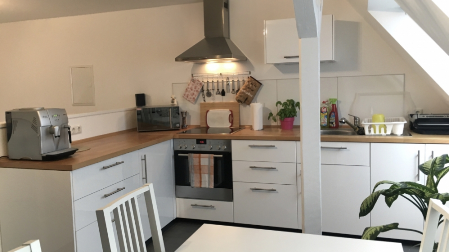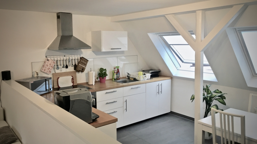 DIE WOHNUNG WURDE VOR WENIGEN JAHREN KOMPLETT MODERNISIERT. SIE HAT EIN WEISS GEFLIESTES BAD MIT WANNE, TOILETTE UND WASCHBECKEN. DORT IST DER BODEN, WIE AUCH IM KÜCHENBEREICH, SCHIEFERFARBEN GEFLIEST. DIE WOHNKÜCHE IST OFFEN ZUM GROSSZÜGIGEN WOHNRAUM.