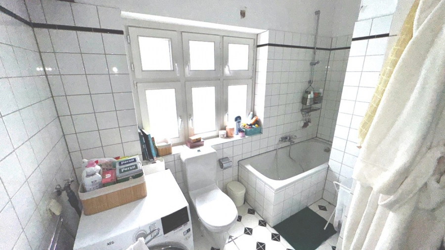 DAS HELL GEFLIESTE TAGESLICHTBAD IST MIT TOILETTE, WASCHTISCH UND BADEWANNE AUSGESTATTET. FÜR DEN BETRIEB EINER WASCHMASCHINE BEFINDEN SICH DORT DIE ENTSPRECHENDEN ANSCHLÜSSE.