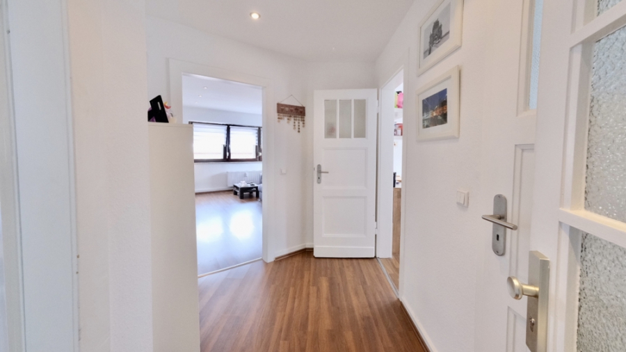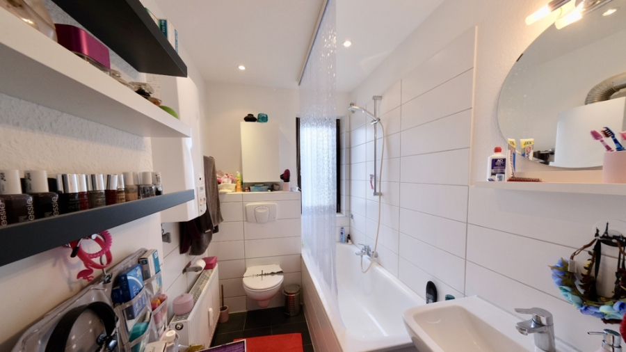 VOR WENIGEN JAHREN ERFOLGTE EINE MODERNISIERUNG DER KOMPLETTEN WOHNUNG. SIE IST MIT EINEM WEISS GEFLIESTEN TAGESLICHTBAD MIT WANNE, TOILETTE UND WASCHBECKEN AUSGESTATTET. DER BODEN DES BADEZIMMERS IST HIERZU PASSEND SCHIEFERFARBEN GEFLIEST.